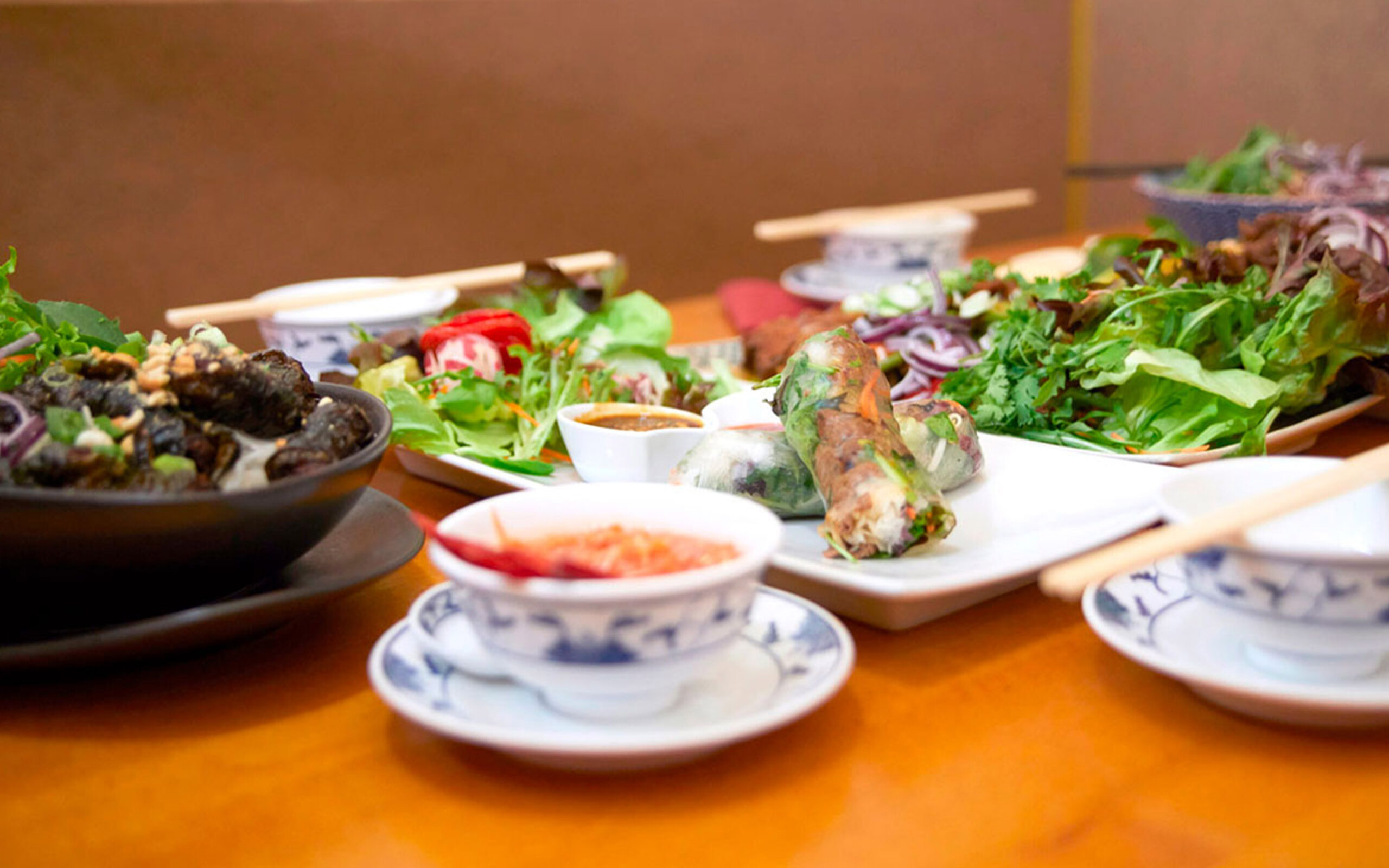 2 Sommerrollen mit knusprigem Tofu, Salat, asiat. Kräuter, Reisnudeln & Hoisinsoße mit Erdnüsse (Varianten möglich: gegrillte Rinderhüfte oder Garnelen)